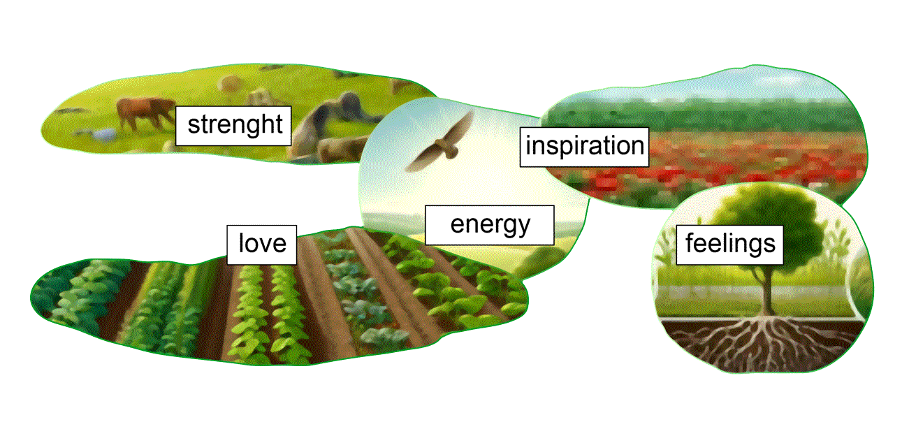 I imagine myself as a collection of farm fields, meadows and orchards, rolling hills and rugged mountains in the distance. There are fields where feelings grow and forests full of ideas and desires, and a water reservoir where energy is stored. Everything is connected and influencing one another.